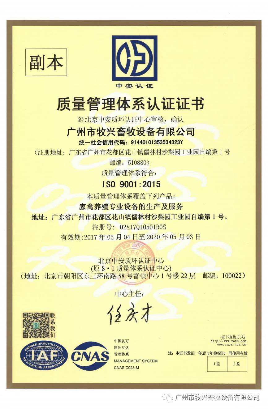 为进一步规范公司生产流程、质环控制、提高效益,形成标准化经营、规范化管理的模式,公司从2016年开展导入质量管理体系。2017年4月份顺利通过了认证中心关于ISO9001:2015质量管理体系的初步认证和审核。2015年5月初,北京评审中心派遣的几位专家来到公司进行质量管理体系运行情况进行评审;经过一天紧张的审查,确认我公司体系运行正常,各方面控制到位,受到几位专家的一致肯定,并顺利通过了审核。